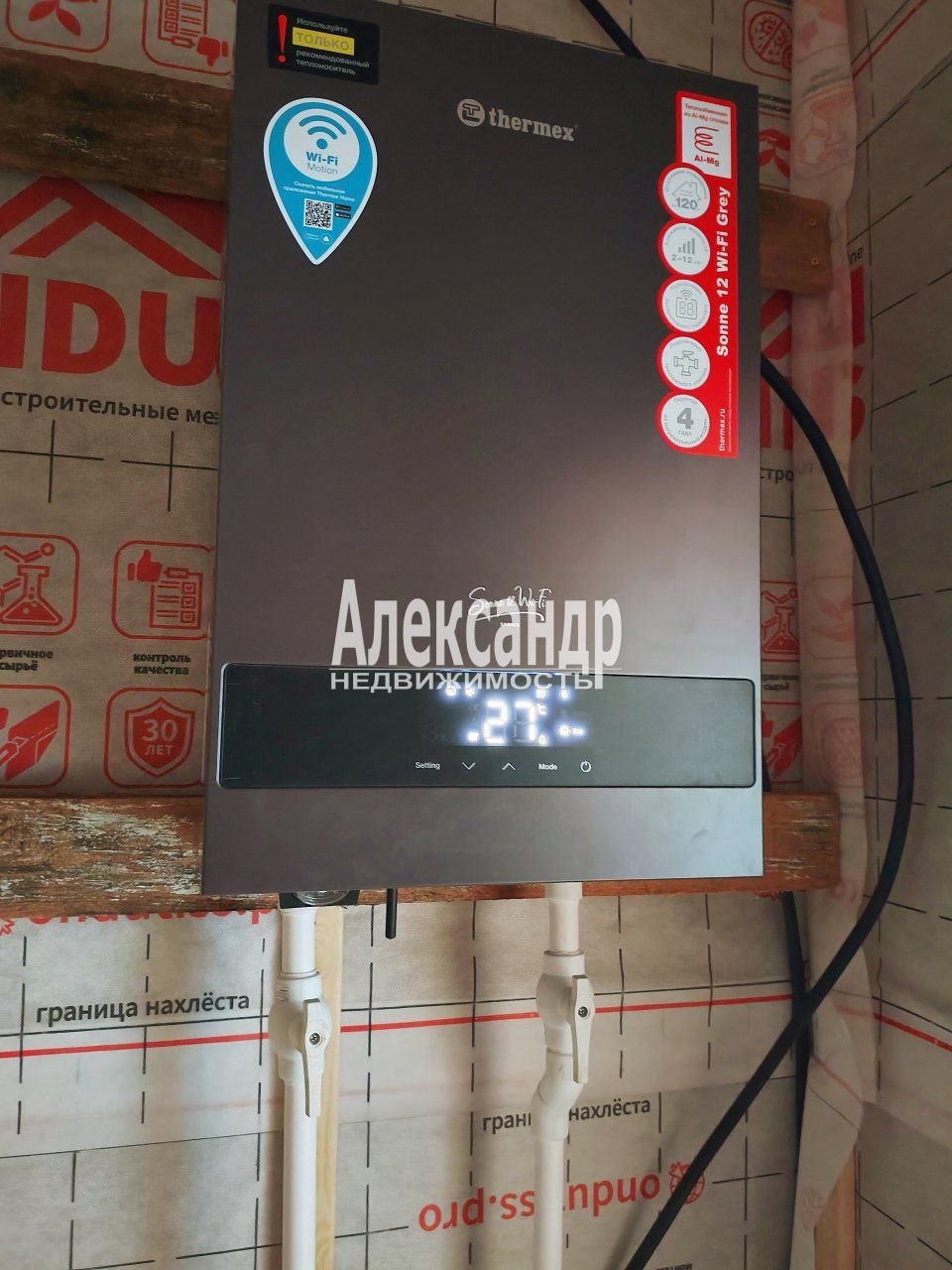 Для отопления дома используется теплый пол с жидкостной системой теплообмена и электрическим котлом Sonne 12 WI-FI с регулируемой мощностью 2-12 кВт и возможностью дистанционного управления через Wi-fi сеть.